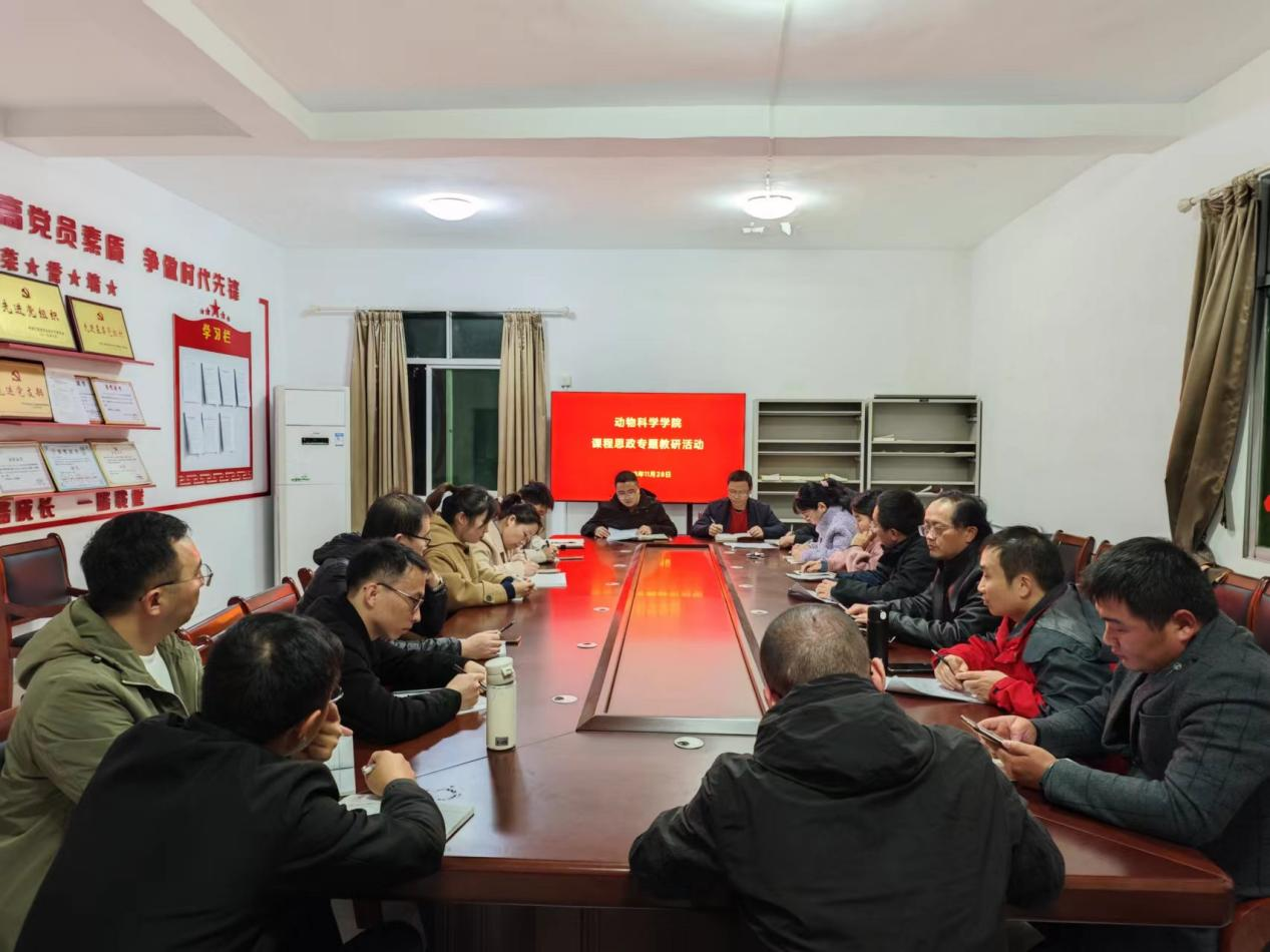 为了贯彻落实《高等学校课程思政建设指导纲要》要求,深化专业课程课程思政教学改革,充分挖掘和整合课程思想政治资源,发挥好每门课程的育人作用,11月28日,动物科学学院在养生馆三楼党员活动室召开课程思政专题研讨会,分院全体专兼职老师参加。