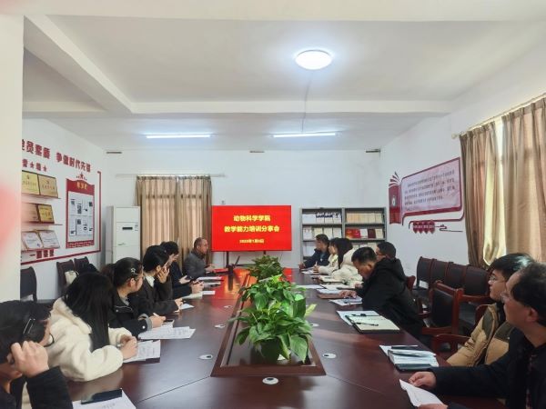 为进一步提高我院教师教学能力,助推学院教学效果和教育质量提升,1月6日下午,动物科学学院在党员活动室开展职业院校教学能力提升培训班分享会,由陈书鹏老师做培训总结分享,分院全体专兼职教师参加。