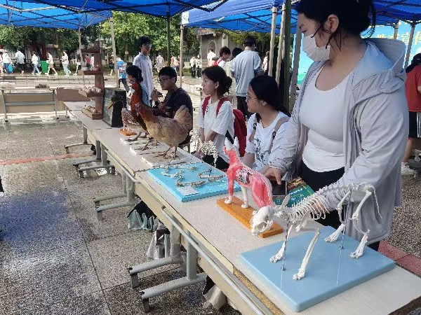 展览会现场,各类动植物标本、中草药药材、园艺作品琳琅满目,吸引了众多师生驻足观看。牧医协会展示了丰富的动物模型,包括哺乳动物、鸟类等,还有动物骨架、医疗器械以及协会成员巧夺天工的蛋雕作品。让参观者在了解动物生长发育、疾病防治等方面知识的同时,感受大自然的神奇于生物多样性。