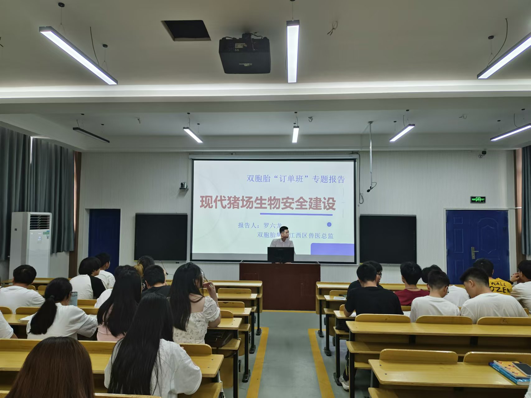 活动第一幕,由双胞胎集团兽医总监开展双胞胎“订单班”现代猪场生物安全建设专题讲座。开始前由动物科学学院负责人介绍授课人,让学生们对双胞胎集团有更加深入的了解。接着授课人正式开始授课,向学生们普及双胞胎猪场的生物安全建设,提到要健全场内生物安全体系。一是猪场内部的布局要求,按照管理要求,科学布局,物理隔离。二是生产管理要求,一定要进行严格的分区管理、分人管理。三是消毒措施要求,根据区域、温度、污染程度不同采取正确的消毒措施。在最后授课人还介绍到集团的疾病防控措施,要在科学的日常检测活动的同时,并提醒同学们在校期间就要注意提高防控意识。