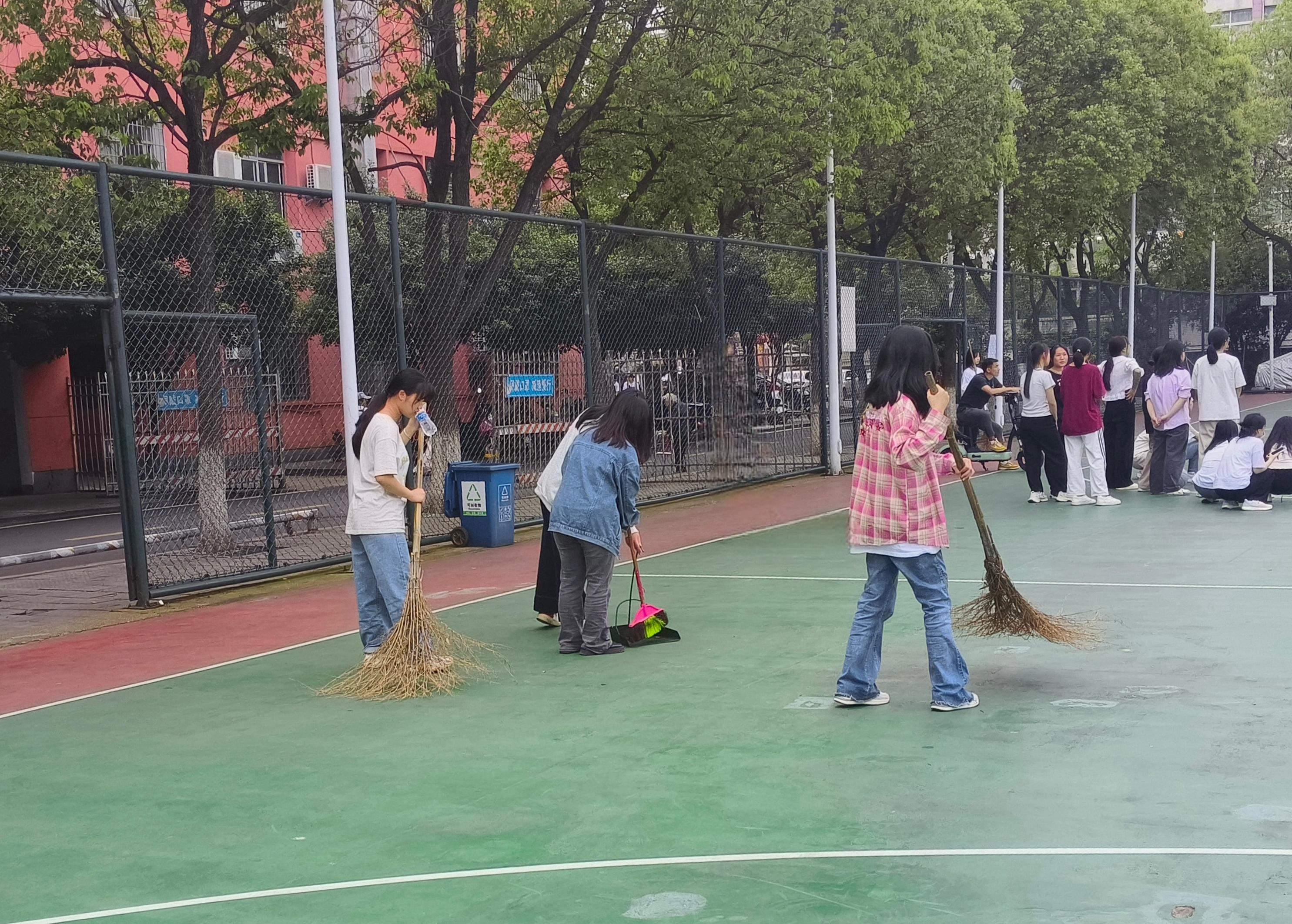 活动过程中,志愿者们认真负责、分工合作,仔细清扫篮球场内的枯枝落叶、杂草杂物,把篮球场每一个角落都打扫得干干净净,为同学们提供一个良好干净的活动场地,也为维护美丽和谐的校园贡献了自己的力量。