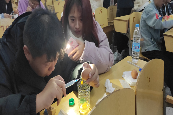 活动伊始,首先由讲师为大家讲解蛋雕的种类以及相应的操作流程。随后,同学们开始进行自我操作。在组装雕刻刀、钻孔、清空蛋液、绘画以及雕刻这些步骤中,同学们认真仔细,不敢丝毫大意。蛋壳本是没有生命的,但在同学们的精雕细琢下,一个个精美的蛋雕作品映入眼帘。